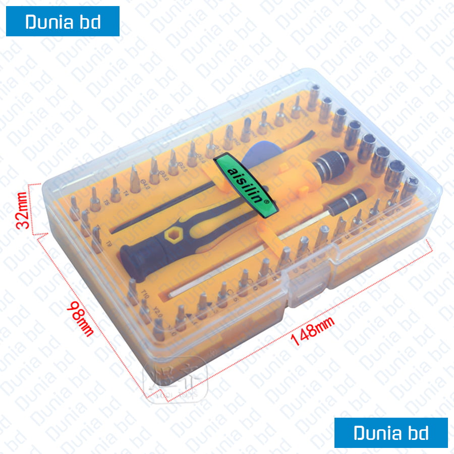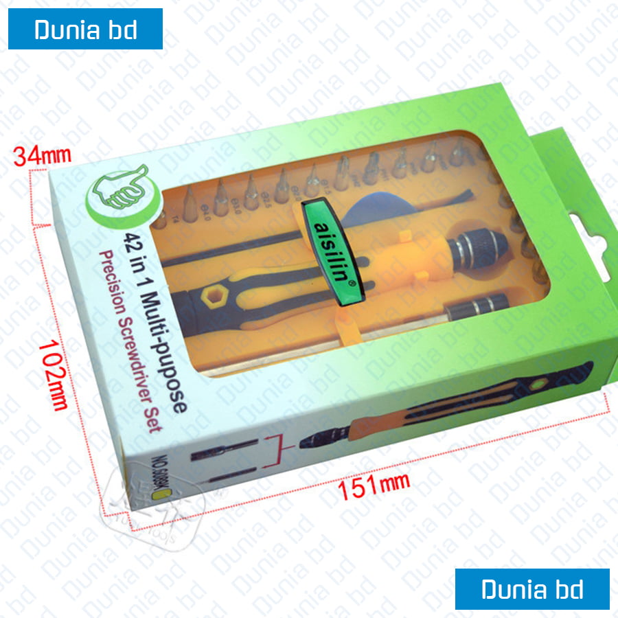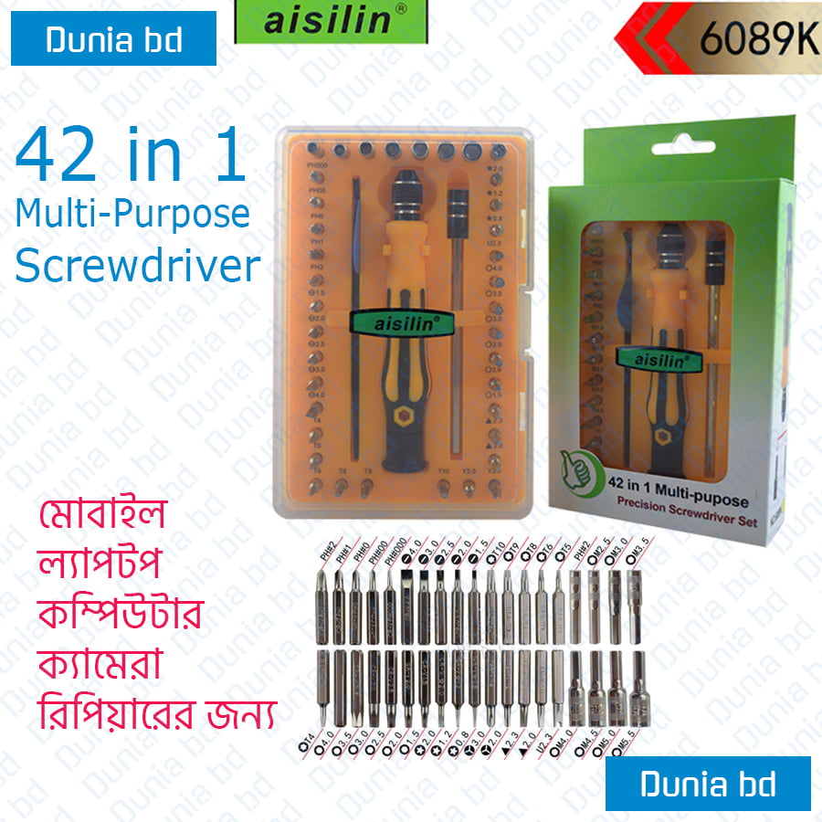 The latest price of Aisilin 42 in 1 Precision Screwdriver Repair Tool Kit Multifunction Screwdrivers Set (6089k) in Bangladesh is [product_price id=”1864″] taka for 1set of 42 In 1 Multipurpose Screwdriver set. You can buy this product at better and cheaper price from our website and also you can visit our warehouse between work hours 10am to 8pm.