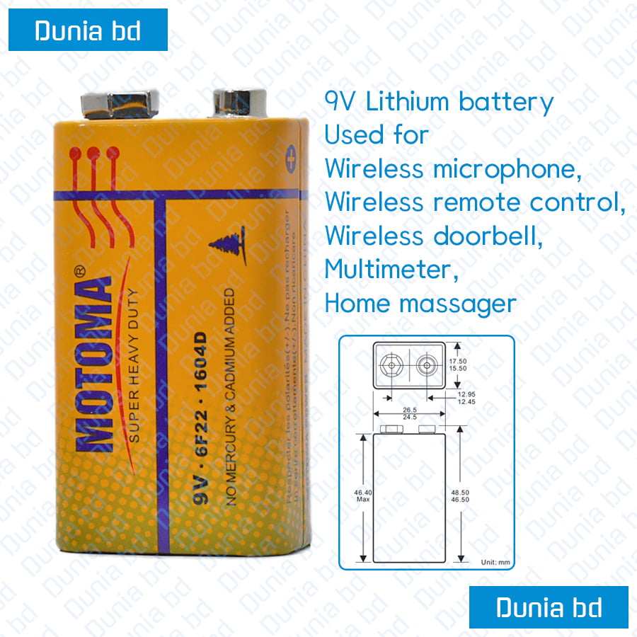In Bangladesh, you can get original Motoma 9V Battery From [dunia_link] . We have few collection of latest [selected_category] to purchase. Order [parent_category] Online at our website Or Visit our warehouse to get your product at lowest price.