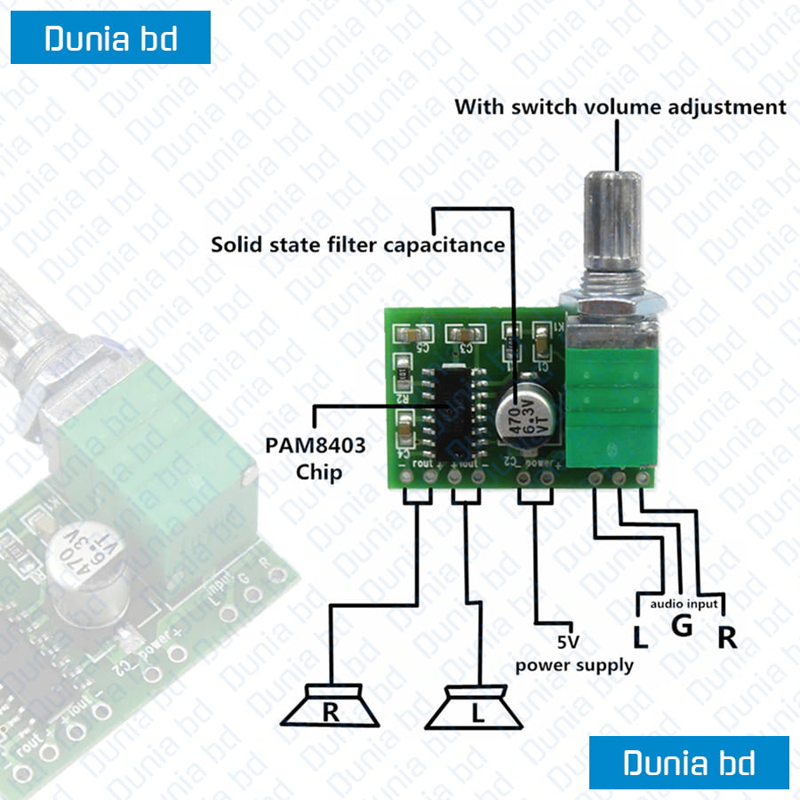 In Bangladesh, you can get original PAM8403 Audio Amplifier Board 2 Channel 3W DC 5V Volume Control with Potentiometer From [dunia_link] . We have few collection of latest [selected_category] to purchase. Order [parent_category] Online at our website Or Visit our warehouse to get your product at lowest price.